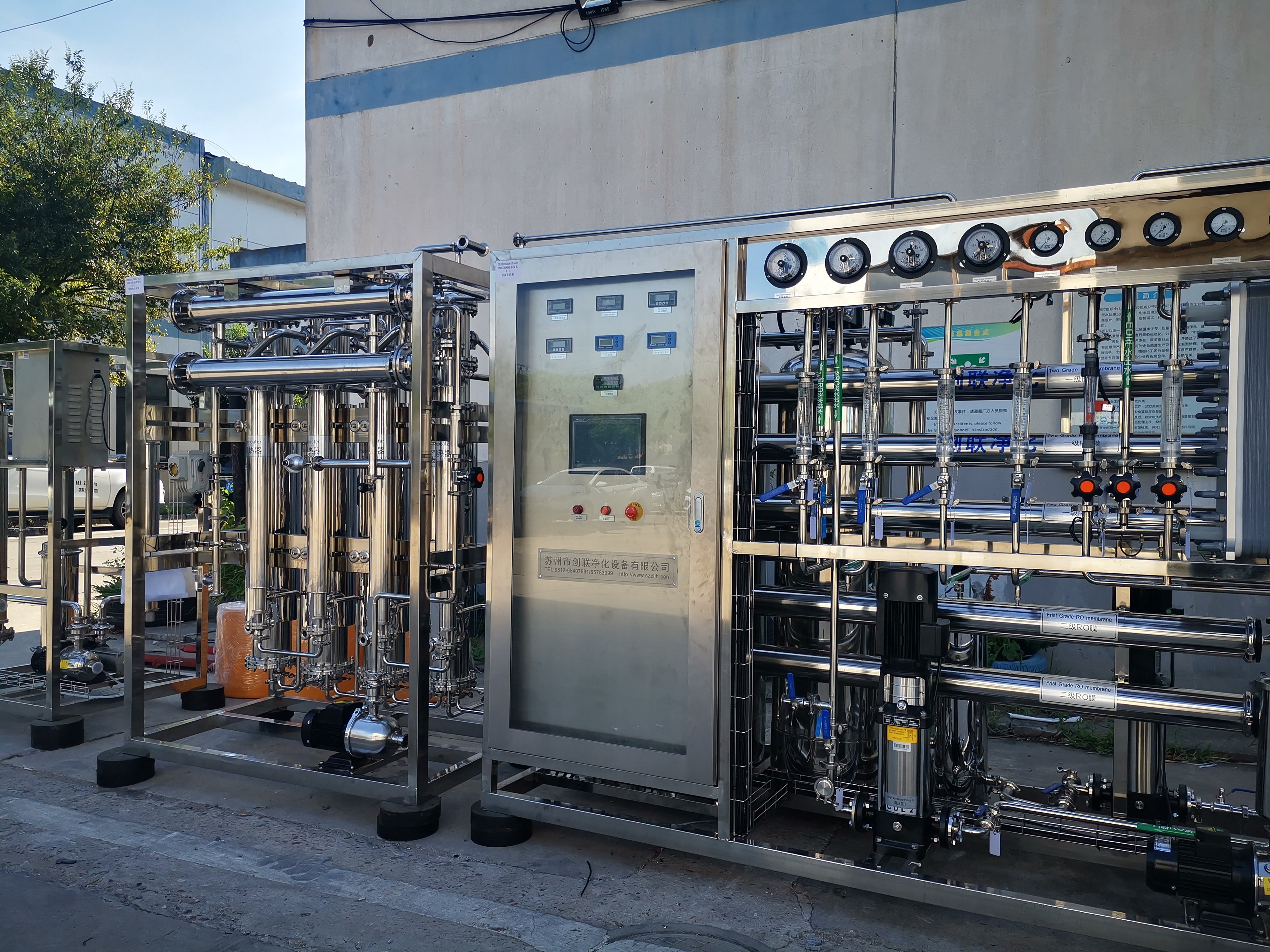 源水箱--- -源水泵--- -多介質過濾器(巴氏消毒)-----活性碳過濾器(巴氏消毒)---阻垢裝置----除氯裝置----保安過濾器----- 一級RO增壓泵-----一級RO反滲透----中間水箱----二級RO增壓泵----二級RO反滲透----EDI裝置----純化水箱(巴氏消毒)----衛生輸送泵--—UV滅菌—用水點(循環回路含控制)---回水流量控制---回水電導控制---回至純化水箱